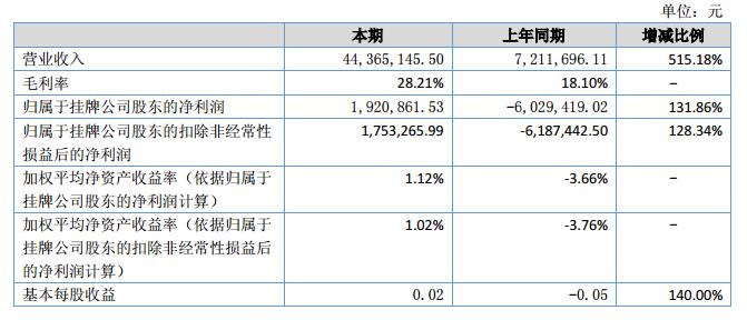 報(bào)告期內(nèi)公司實(shí)現(xiàn)收入4,436.51萬元,較去年同期增加了3,715.34萬元,增幅515.18%;毛利率28.21%,去年同期毛利率18.10%;實(shí)現(xiàn)凈利潤192.09萬元,較去年同期增加755.80萬元,增幅134.08%。
