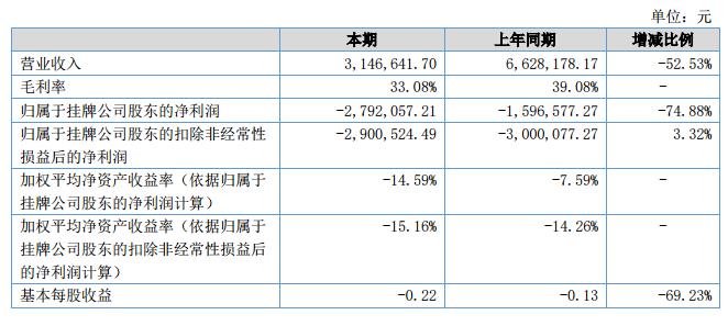 報告期內公司營業(yè)收入3,146,641.70元,較上年同期減少52.53%;公司實現凈利潤-2,792,057.21元,較上年同期減少74.88%。?