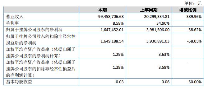公司實現(xiàn)營業(yè)收入99,458,706.68元,較上年同期增加389.96%;營業(yè)成本90,930,000.00元,較上年同期增加588.08%,本期歸屬于掛牌公司股東的凈利潤1,647,452.01元,較上年同期減少58.62%。報告期內(nèi)公司營業(yè)收入大幅增加的主要原因是完成大額銷售合同;營業(yè)成本大幅增加主要原因是營業(yè)收入增長導(dǎo)致營業(yè)成本增加。凈利潤減少原因為本年成本占比較高。?