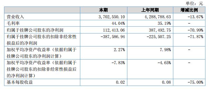 報(bào)告期內(nèi)公司營(yíng)業(yè)收入370.26萬(wàn)元,同比下降13.67%,營(yíng)業(yè)成本207.18萬(wàn)元,凈利潤(rùn)13.26萬(wàn)元。?