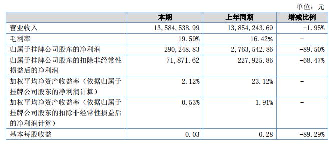 公司在2018年主營業(yè)務(wù)保持平穩(wěn),實現(xiàn)營業(yè)收入1358.45萬元,較上年同期下降26.97萬元,降幅1.95%,公司上半年出口銷售數(shù)量較上年同期略有增加,但是公司對于不同客戶給與不同的銷售折扣,由于公司的客戶集中度增加,大型客戶的銷售占比增加,銷售單價相對變低,致使銷售額未能同比增加。公司2018年上半年實現(xiàn)凈利潤29.02萬元,較上年大幅下降,主要是由于公司取得的政府補助大幅減少。?
