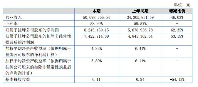 報告期內,公司實現(xiàn)營業(yè)收入50,098,366.54元,同比增長46.03%%,其中主營業(yè)務收入50,094,206.79元,同比增長47.44%。實現(xiàn)凈利潤8,245,459.15元,同比增長62.35%。本報告期未,公司資產總額288,625,361.57元,同比增加60,307,769.65元,增長26.41%;資產負債率30.92%,同比上升13.63%;凈資產199,388,486.71元,較年初增加8,245,459.15元,增長4.31%。同時公司在人才儲備、管理經驗、科研探索等方面繼續(xù)穩(wěn)步提升并保持良好水平,公司相比2017年營業(yè)收入、凈利潤均保持了良好增長態(tài)勢。?
