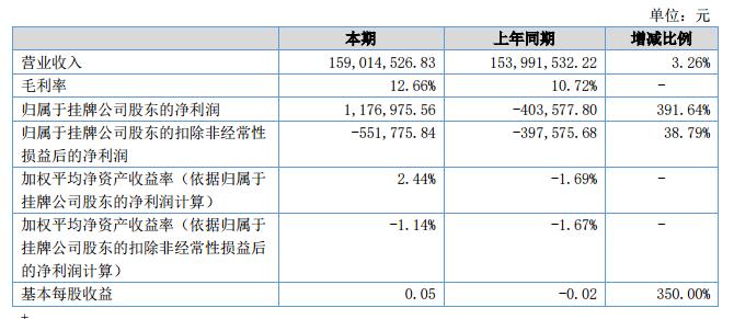 報(bào)告期內(nèi),公司實(shí)現(xiàn)營(yíng)業(yè)收入15,901.45萬(wàn)元,同比去年增長(zhǎng)3.26%;毛利率12.66%,同比去年提高約2%;歸屬于掛牌公司股東凈利潤(rùn)117.70萬(wàn)元,同比去年增長(zhǎng)391.64%。基本每股收益0.05元,同比去年增長(zhǎng)391.64%。?