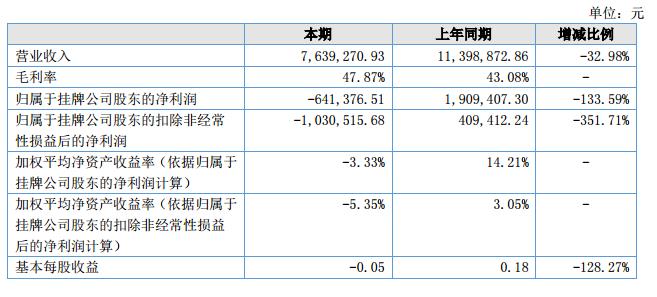 營業(yè)收入本期763.93萬元,同比減少375.96萬元,減少比例32.98%;實(shí)現(xiàn)的凈利潤-83.90萬元,上年同期為190.94萬元。?