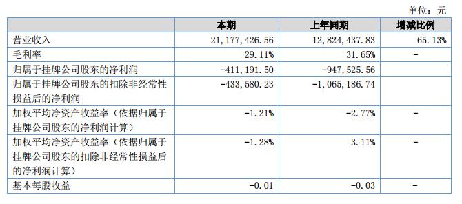 報(bào)告期內(nèi),公司實(shí)現(xiàn)營(yíng)業(yè)收入2,117.74萬(wàn)元,同比增長(zhǎng)65.13%。凈利潤(rùn)為-41.12萬(wàn)元,相比同期虧損有所收窄。?