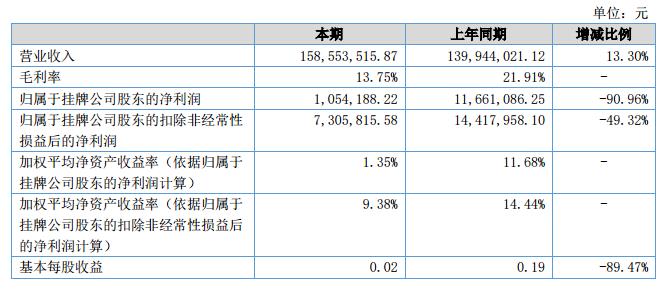 挖貝網(wǎng)9月12日,宜美科技(證券代碼:836941)近日公布的2018年半年報(bào)顯示,截至2018年6月30日,企業(yè)實(shí)現(xiàn)營(yíng)收1.59億元;歸屬于掛牌公司股東的凈利潤(rùn)為105.41萬(wàn)元。