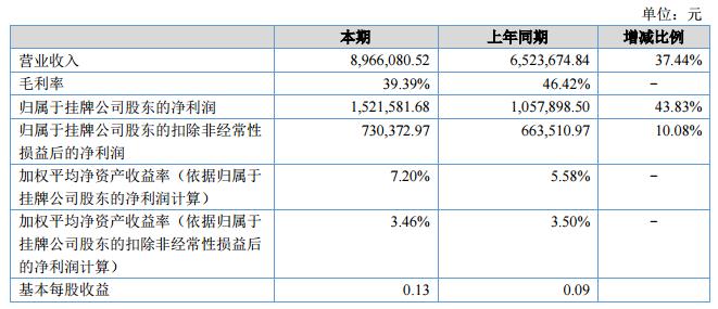 報告期內(nèi),公司實現(xiàn)營業(yè)收入8,966,080.52元,凈利潤1,521,581.68元。期末公司總資產(chǎn)為27,499,122.60元,凈資產(chǎn)為21,128,474.49元。?