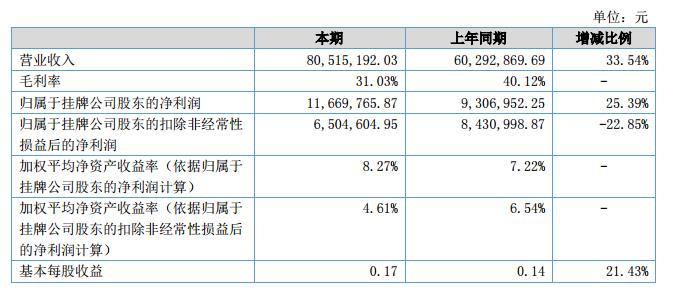 報(bào)告期內(nèi)公司實(shí)現(xiàn)營業(yè)總收入8,051.52萬元,較去年同期增長了33.54%。其中主營業(yè)務(wù)收入7,579.82萬元,比去年同期增長25.72%,其他業(yè)務(wù)收入471.70萬元;歸屬于母公司凈利潤1,166.98萬元,較去年同期增長25.39%,扣非后歸屬于母公司凈利潤650.46萬元,較去年同期下降了22.85%。?