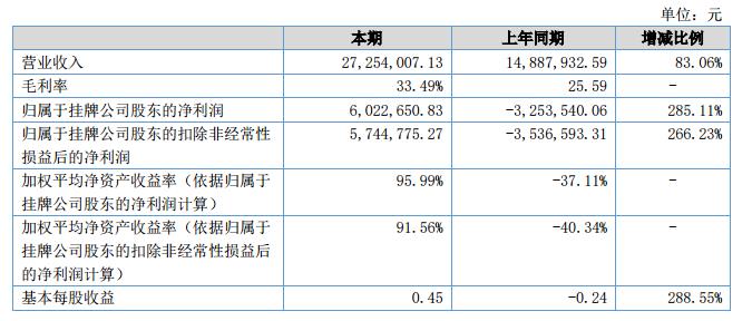 營業(yè)收入27,254,007.13元,營業(yè)成本17,959,449.17元,銷售費用564,002.86元,管理費用及研發(fā)費用2,392,871.51元,實現(xiàn)凈利潤6,022,650.83元。?