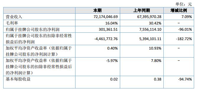 報(bào)告期內(nèi),公司實(shí)現(xiàn)營業(yè)收入72,174,046.69元,較上期增長4,778,076.41元,同比上升7.09%,凈利潤301,361.51元,較上期下降7,254,752.59元,同比下降96.01%。?