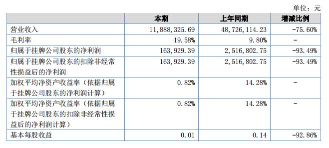 報告期內(nèi)實現(xiàn)營業(yè)收入11,888,325.69元,較上年同期下降75.60%;營業(yè)成本9,560,300.82元,較上年同期下降78.25%;實現(xiàn)凈利潤163,929.39元,較上年同期下降93.49%。