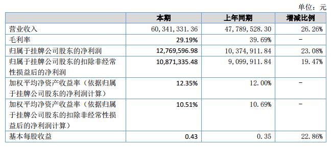 報(bào)告期內(nèi)公司銷(xiāo)售收入60,341,331.36元,比上期同比增長(zhǎng)26.26%,本期銷(xiāo)售凈利潤(rùn)12,769,596.98元,比上期同比增長(zhǎng)23.08%。?