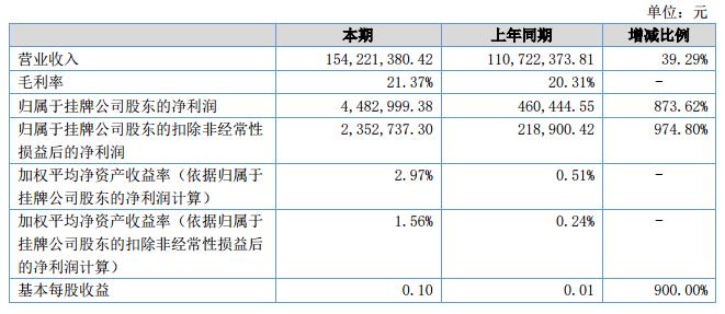 公司實(shí)現(xiàn)營業(yè)收入154,221,380.42元,較上年同期增加39.29%;公司營業(yè)成本121,256,986.22元,較上年同期增加37.43%;公司凈利潤4,482,999.38元,較上年同期增加873.62%。?