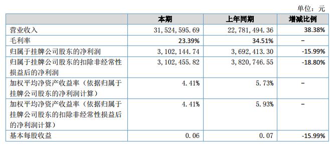 公司實(shí)現(xiàn)營業(yè)收入3152.46萬元,較上年同期增長(zhǎng)38.38%;凈利潤304.86萬元,較上年同期減少59萬元。?