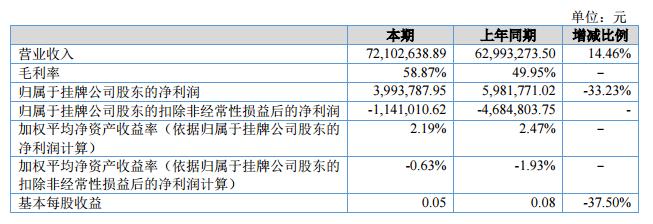 報(bào)告期內(nèi),公司實(shí)現(xiàn)營(yíng)業(yè)收入7,210.26萬元,較上年同期增長(zhǎng)14.46%;公司實(shí)現(xiàn)歸屬于母公司的凈利潤(rùn)399.38萬元,較上年同期減少33.23%。?