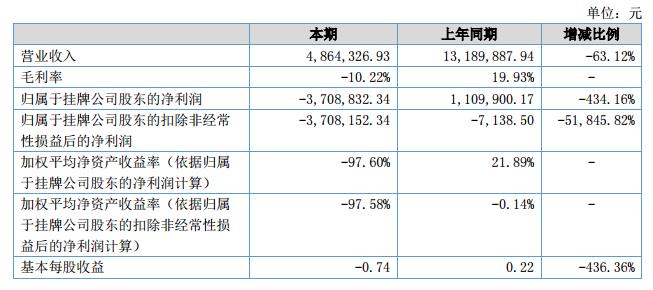 報告期內公司實現營業(yè)收入4,864,326.93元,較上年同期下降63.12%;公司實現凈利潤-3,708,832.34元,較上年同期下降434.16%。?