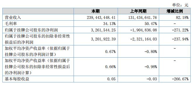 報告期內(nèi),公司實現(xiàn)營業(yè)收入2.3億元,較上年同期增長82.18%,實現(xiàn)凈利潤113.48萬元,歸屬于掛牌公司的股東凈利潤326.15萬元。截止報告期末,公司總資產(chǎn)為13.66億元,凈資產(chǎn)為4.87億元,注冊資本為6,075萬元。?
