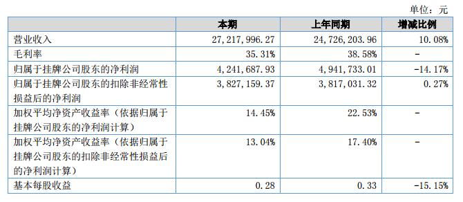 報(bào)告期內(nèi),公司營(yíng)業(yè)收入27,217,996.27元,同比增長(zhǎng)10.08%;營(yíng)業(yè)成本17,608,650.43元,同比增長(zhǎng)15.94%;凈利潤(rùn)4,241,687.93元,同比下降14.17%;資產(chǎn)總額40,356,535.86元,比上年度末增長(zhǎng)14.45%;負(fù)債總額8,881,806.71元,比上年度末增長(zhǎng)10.65%;所有者權(quán)益總額31,474,729.15元,比上年度末增長(zhǎng)15.58%;經(jīng)營(yíng)活動(dòng)產(chǎn)生的現(xiàn)金流量?jī)纛~2,464,230.46元,同比增長(zhǎng)89.54%。?