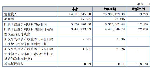 公司累計(jì)實(shí)現(xiàn)營(yíng)業(yè)收入84,110,615.00元,同比增長(zhǎng)9.29%;實(shí)現(xiàn)凈利5,207,970.66元,同比下降17.50%;截止2018年06月30日,公司總資產(chǎn)為318,651,955.07元,同比下降19.73%;凈資產(chǎn)達(dá)到209,788,935.48元,同比增長(zhǎng)2.09%。?
