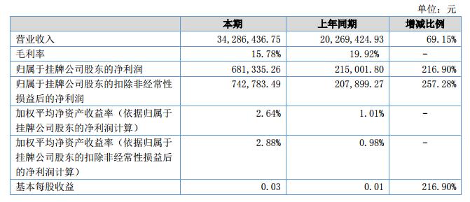 報告期內(nèi),公司的經(jīng)營模式和主營業(yè)務(wù)未發(fā)生改變,在2018年1-6月期間,實現(xiàn)營業(yè)收入34,286,436.75元,較上年同期增長69.15%,凈利潤為681,335.26元,較上年同期增加216.90%。?