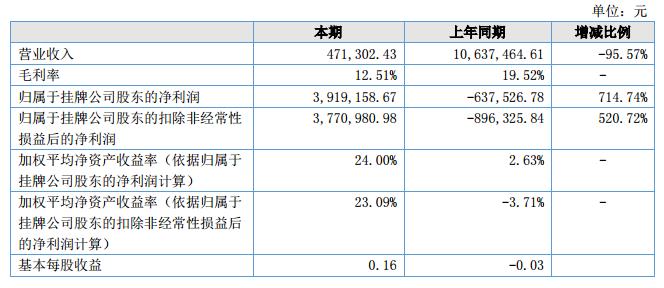截至2018年6月30日,公司總資產(chǎn)21,717,368.33元,較報告期初32,674,543.11元下降33.53%,主要原因是本期回收了一部分應收賬款,這筆回收資金歸還了部分負債,導致資產(chǎn)整體下降。本期營業(yè)收入為471,302.43元,較上年同期10,637,464.41元下降95.57%,主要原因是上年度公司將子公司新材料出售后,公司不再經(jīng)營原有的制造型業(yè)務,本期公司正處于業(yè)務轉(zhuǎn)型階段,短期來看部分財務指標將有所下降。歸屬于掛牌公司股東的凈利潤為3,919,158.67元,較上年同期-637,526.78元上升714.74%,主要是因為本期產(chǎn)生一筆處置長期股權(quán)投資產(chǎn)生的投資收益6,904,976.37元。負債總計為3,429,056.46元,較期初183,05,389.91元下降81.27%,主要是本期其他應付款余額大幅減少,優(yōu)化了資產(chǎn)負債結(jié)構(gòu)。?
