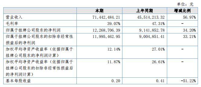 報(bào)告期內(nèi)實(shí)現(xiàn)營(yíng)業(yè)收入7,144.25萬(wàn)元,較上年同期營(yíng)業(yè)收入增長(zhǎng)56.97%,歸屬于母公司股東的凈利潤(rùn)1,226.87萬(wàn)元,較上年同期增長(zhǎng)34.20%。?