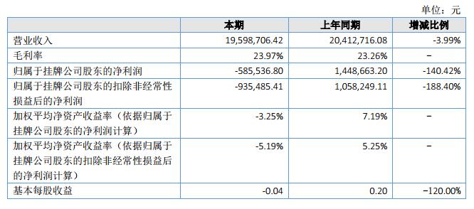 2018年上半年,公司實(shí)現(xiàn)營業(yè)收入19,598,706.42元,較上年同期減少814,009.66元,同比下降3.99個百分點(diǎn),主要原因是市場競爭加劇,公司為保持市場占有率,產(chǎn)品價格小幅下調(diào),受此影響銷售收入同比下降。2018年上半年實(shí)現(xiàn)凈利潤-585,536.80元,同比減少2,034,200.00元。?