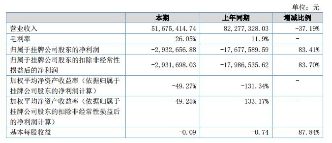 報(bào)告期內(nèi),公司營業(yè)收入全部為主營業(yè)務(wù)收入,收入額為51,675,414.74元,同比下降37.19%。成本為38,216,005.76元,同比下降47.28%。凈利潤為-2,894,687.25元,同比上升83.71%。經(jīng)營性現(xiàn)金凈流量為-12,573,989.89元,同比上升53.01%。?