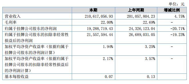 報(bào)告期內(nèi),公司資產(chǎn)總額為1,301,373,222.62元,負(fù)債總額200,246,355.86元,資產(chǎn)負(fù)債率15.39%,歸屬于母公司所有者凈資產(chǎn)總額1,001,608,213.27元。實(shí)現(xiàn)營(yíng)業(yè)收入210,617,056.93元,同比增長(zhǎng)4.75%;營(yíng)業(yè)成本164,281,943.14元,同比增加了5.69%;毛利率22.00%;凈利潤(rùn)27,520,033.66元。報(bào)告期內(nèi),公司財(cái)務(wù)狀況總體保持穩(wěn)定。?
