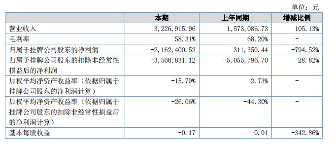 報(bào)告期內(nèi),公司實(shí)現(xiàn)營(yíng)業(yè)收入322.69萬(wàn)元,較上年同期增長(zhǎng)了105.13%;凈利潤(rùn)為-213.83萬(wàn)元,較上年同期減少了241.24萬(wàn)元,下降率880.02%;收入在前期市場(chǎng)投入及渠道建設(shè)積累的基礎(chǔ)上實(shí)現(xiàn)了穩(wěn)定增長(zhǎng),利潤(rùn)下降的主要原因系研發(fā)投入較上年同期上升幅度較大、及收到政府補(bǔ)助較上年同期下降幅度較大所致。