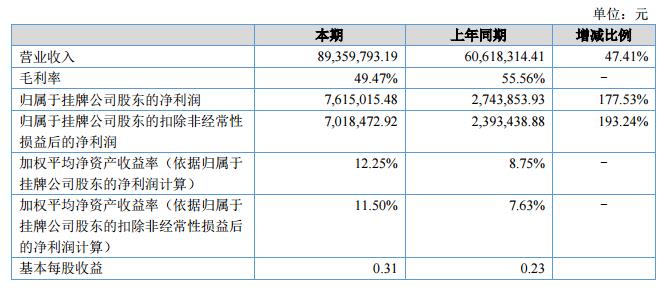 報(bào)告期內(nèi)銷售收入8935.98萬元,較上年同期增加47.41%。與此同時(shí)公司通過提高售前、售后服務(wù)質(zhì)量,夯實(shí)小鳥品牌,報(bào)告期內(nèi)營(yíng)業(yè)成本4514.98萬元,較上年同期增加67.61%;由單一產(chǎn)品銷售商向方案提供服務(wù)商的逐步轉(zhuǎn)型過程中,售后成本逐步增加,導(dǎo)致毛利率從去年同期的55.56%下降到49.47%。歸屬于掛牌公司股東的凈利潤(rùn)實(shí)現(xiàn)761.50萬元,較上年同期增加177.53%。?