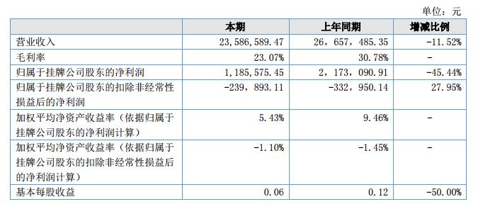 2018年1-6月,公司營業(yè)收入為2358.66萬元,同比減少11.52%;公司營業(yè)成本1,814.56萬元,同比減少1.66%;凈利潤為118.56萬元,同比減少45.44%;本期期末每股收益為0.06元。公司上半年整體發(fā)展趨勢較好,雖然銷售較上年同期有一定比例的減少,但公司仍有較多的盈利,主要原因是上半年政府補助有可觀的收入。?