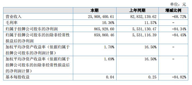 2018年上半年實(shí)現(xiàn)營(yíng)業(yè)收入2,590.84萬(wàn),較去年同期減少68.72%,實(shí)現(xiàn)凈利潤(rùn)86.59萬(wàn)元,較去年同期減少84.34%。?