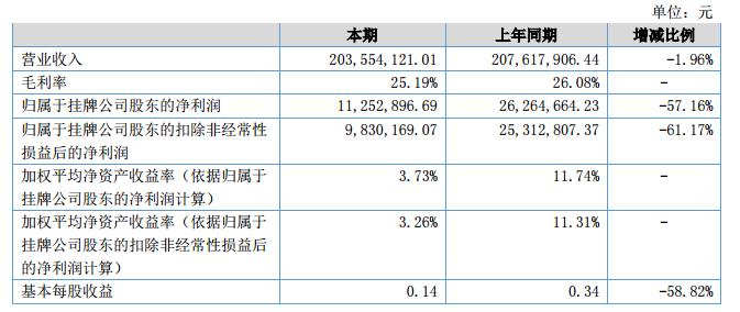 公司實(shí)現(xiàn)營(yíng)業(yè)收入203,554,121.01元,同比下降1.96%;實(shí)現(xiàn)凈利潤(rùn)11,252,846.71元,同比下降57.16%;扣除非經(jīng)常性損益后歸母公司的凈利潤(rùn)為9,830,169.07元,同比下降61.17%。截至2018年6月30日,公司總資產(chǎn)786,268,771.90元,較上年末增長(zhǎng)10.76%,凈資產(chǎn)369,679,429.97元,較上年末增長(zhǎng)25.08%。?