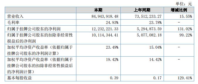 報告期內(nèi)公司實現(xiàn)營業(yè)收入84,943,918.48元,較上年同期增長了15.55%;營業(yè)成本63,765,742.24元,較上年同期增加了13.8%;實現(xiàn)凈利潤12,232,221.33元,較上年同期增長了131.02%;成本的增長率低于營業(yè)收入的增長率,公司的盈利能力不斷增強。報告期內(nèi),公司總資產(chǎn)84,241,638.37元,同比增長10.43%,凈資產(chǎn)58,247,931.26元,同比增長了26.58%。?
