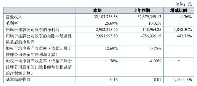 報(bào)告期內(nèi),公司營(yíng)業(yè)收入3,210.37萬(wàn)元,較上年同期下降1.76%;利潤(rùn)總額339.35萬(wàn)元,比上年同期增長(zhǎng)1,112.88%;凈利潤(rùn)290,23萬(wàn)元,比上年同期增長(zhǎng)1,848.30%,主要原因是加強(qiáng)了對(duì)各職能部門(mén)進(jìn)行了的KPI考核,產(chǎn)品毛利上升。?