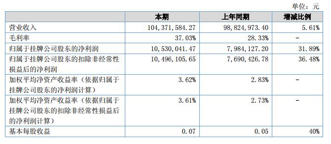 報告期內(nèi),公司實現(xiàn)營業(yè)收入104,371,584.27元,較上年同期增加5,546,610.87元,增長5.61%,報告期內(nèi),公司營業(yè)成本65,720,489.40元,較上期減少5,111,131.04元,降低7.22%。?