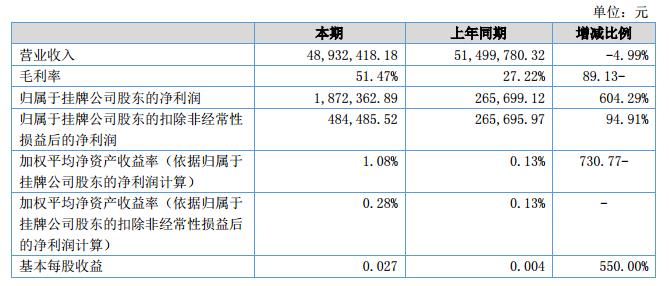 本報告期內,公司營業(yè)收入48,932,418.18元,同比下降4.98%,營業(yè)利潤為1,107,814.47元,同比增加256.22%。?
