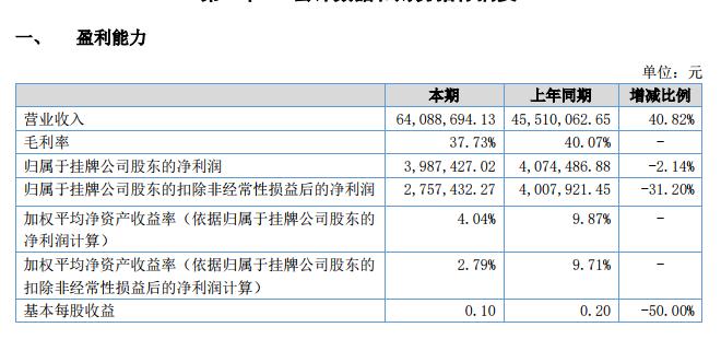 2018 年上半年公司簽訂的合同保持穩(wěn)定,實現(xiàn)營業(yè)收入 6,408.87 萬元,營業(yè)成本 3,990.74 萬元,凈利潤 398.74 萬元;上年同期營業(yè)收入 4,551.01 萬元,營業(yè)成本 2,727.48 萬元,凈利潤 407.45 萬元;本期與上年同期相比分別增長 40.82%、46.32%及-2.14%。營業(yè)收入與去年同期增長較大的主要原因是本報告期的生產(chǎn)經(jīng)營規(guī)模較去年擴(kuò)大,完工驗收項目比去年同期增多;營業(yè)成本增加較多的主要原因是原材料成本及直接人工成本上升;凈利潤下降的主要原因是制造成本增長,員工增加及工資水平上升導(dǎo)致期間費用增加較多,研發(fā)費用比去年同期增長較多。