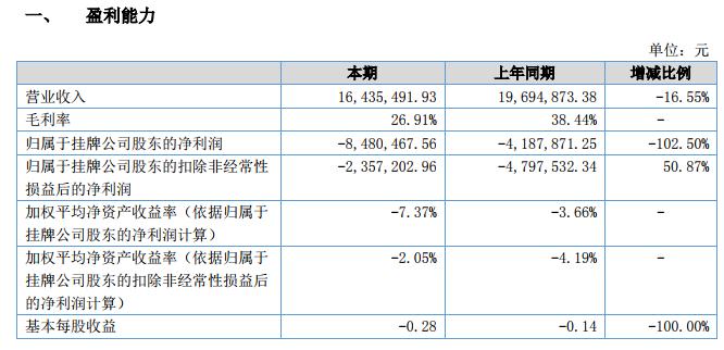 報(bào)告期內(nèi)公司實(shí)現(xiàn)營(yíng)業(yè)收入 1,643.55 萬(wàn)元,較上年同期減少 325.94 萬(wàn)元,減幅 16.55%;歸屬于掛牌公司股東的凈利潤(rùn) -848.05 萬(wàn)元,較上年同期減少 429.26 萬(wàn)元,減幅 102.50%。