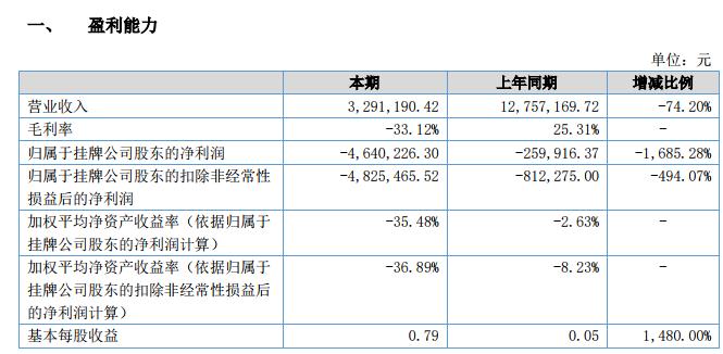 公司實現(xiàn)營業(yè)收入 3,291,190.42 元,較上年同期下跌 74.20%,主要原因是本年度上半年在開發(fā)重大項目,而制作時間均在下半年,如:與網(wǎng)絡播放平臺聯(lián)合制作綜藝節(jié)目《愛笑會議室第二季》;承接地方衛(wèi)視電視劇制作業(yè)務等。實現(xiàn)歸屬掛牌公司股東的凈利潤-4,640,226.30 元,較上年同期下降 1,685.28%,主要原因是受喜劇市場行業(yè)影響,上半年欄目及藝人經(jīng)紀業(yè)務減少,且公司主要業(yè)務欄目及網(wǎng)劇制作周期較長,預計下半年《簡職男人》、《愛笑會議室第二季》制作完成,收入會隨之增加;報告期內(nèi)期間費用較上期同比增加了 29.34%,主要是公司的人員成本較上年同期有較大的增加,上述綜合因素為凈利潤下降的主要原因。本期毛利率為-33.12%,主要原因是欄目收入中《愛笑會議室第一季》未進行廣告招商,根據(jù)播放視頻平臺會員點擊收益分成,實際制作成本大于最終收益,因此該項目虧損;公司現(xiàn)有話劇業(yè)務,根據(jù)劇場租賃費協(xié)商,話劇演出時間是周四、周五、周六、周日,由于周四和周日上座率不高,門票收入較少,但演員每場演出成本固定,造成最后話劇演出業(yè)務虧損,毛利率為負數(shù)。