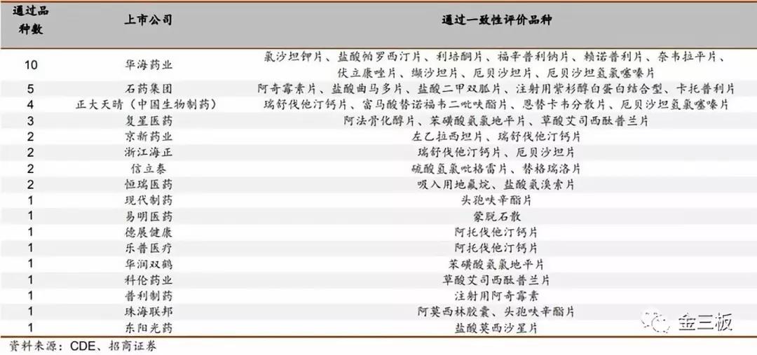 根據(jù)CDE和招商證券的統(tǒng)計(jì),目前通過一致性評(píng)價(jià)的品種涉及17個(gè)上市公司,其中A股14家,港股3家,新三板0家。