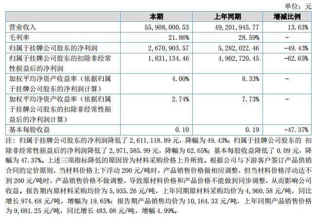 經(jīng)營業(yè)績情況:報告期內(nèi)實現(xiàn)營業(yè)收入55,908,000.19元,同比增長13.63%;利潤總額3,142,239.50元,同比降低48.42%;凈利潤2,670,903.57元,同比降低49.43%。資產(chǎn)負債率為54.36%,總資產(chǎn)及凈資產(chǎn)分別同比增長13.07%和31.15%。?
