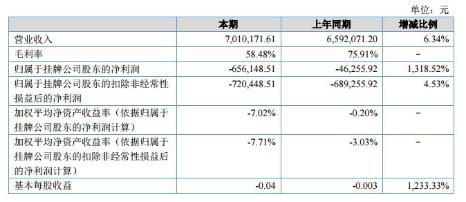 報告期內(nèi)公司實現(xiàn)營業(yè)收入7,010,171.61元,較上年同期6,592,071.20元,增長了6.34%,報告期內(nèi)公司進一步加大市場資源的開拓,公司規(guī)模效應(yīng)和品牌效應(yīng)進一步顯現(xiàn)。營業(yè)成本2,910,426.87元,較上年同期1,587,970.13元,增長了83.28%,報告期內(nèi)毛利率為58.48%,較上期下降了17.43個百分點,?下降主要原因為技術(shù)開發(fā)中課程資源建設(shè)所需素材儲備減少需要二次開發(fā),以及技術(shù)服務(wù)中的教材出版費用增加所致。凈利潤為-656,148.51元,較上年同期-46,255.92元,增虧609,892.59元,主要原因是營業(yè)外收入較上年同期減少621,700元,主要為上期收到的掛牌補貼600,000元所致;本期銷售費用發(fā)生1,997,899.09元,較上年同期下降16.10%。?
