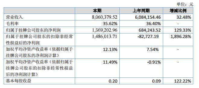 報(bào)告期內(nèi),公司實(shí)現(xiàn)收入8,060,379.52元,比去年同期增長(zhǎng)32.48%,利潤(rùn)總額2,092,270.62元,凈利潤(rùn)1,569,202.96元,經(jīng)營(yíng)活動(dòng)產(chǎn)生的現(xiàn)金流量?jī)纛~309,849.08元,投資活動(dòng)產(chǎn)生的現(xiàn)金流量?jī)纛~1,729,728.74元。報(bào)告期內(nèi)收入增長(zhǎng)的原因?yàn)槭袌?chǎng)需求上升、市場(chǎng)知名度上升。利潤(rùn)總額和凈利潤(rùn)分別增長(zhǎng)188.18%、129.33%,增長(zhǎng)的主要原因是本期收入增長(zhǎng)、同時(shí)管理費(fèi)用中中介等費(fèi)用減少。?