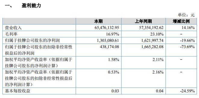凈利潤分析:本期實(shí)現(xiàn)凈利潤為 130.31 萬元,上年同期為 162.20 萬元,減少 31.89 萬元,同比下降 19.66%,凈利潤下降的原因營業(yè)利潤下降所致。營業(yè)利潤下降的主要原因是本期產(chǎn)品的毛利率下降,本期毛利率為 16.97%,比上年同期的 23.10%,下降 6.13%。本期客戶要求產(chǎn)品降價(jià),產(chǎn)品平均降價(jià)約 3%,同時(shí)原材料價(jià)格與上年同期對(duì)比上漲約 5%,產(chǎn)品降價(jià)和原材料漲價(jià)是毛利率降低的主要原因。