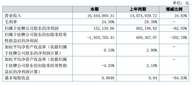 報(bào)告期內(nèi),公司實(shí)現(xiàn)營業(yè)收入16,444,069.31元,同比增長16.83%,實(shí)現(xiàn)凈利潤152,139.96元(扣除非經(jīng)常性損益后的凈利潤為-1,959,705.43元),凈利潤下降主要原因:1)毛利率下降:公司毛利率下降至24.30%,主要由于公司國外出口額下降,國內(nèi)銷售穩(wěn)步增長,但國內(nèi)銷售產(chǎn)品毛利率低于國外銷售毛利率,從而導(dǎo)致公司整體毛利率下降。2)費(fèi)用上升:公司銷售費(fèi)用同比上升108.69%,主要由于公司為擴(kuò)展國內(nèi)市場,從2017年下半年開始增加銷售人員、增加廣告投入導(dǎo)致;研發(fā)費(fèi)用同比上升142.67%,主要由于公司增加了“一種家用或小型商用變頻調(diào)速自動(dòng)恒溫?zé)岜霉┡瘷C(jī)組”、“一種低環(huán)境溫度熱泵集中供暖系統(tǒng)”等項(xiàng)目的研發(fā)投入。?