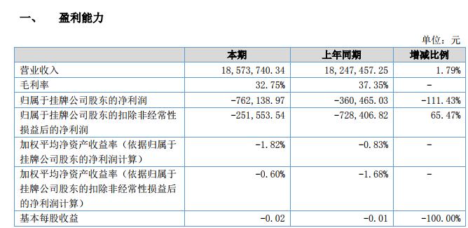 2018 年 1—6 月份,公司實(shí)現(xiàn)營(yíng)業(yè)總收入 1,857.75 萬元,同比增長(zhǎng) 1.79%;凈利潤(rùn)為-76.21 萬元,同比減少 111.43%。截止 2018 年 6 月 30 日,公司總資產(chǎn)為 8,160.38 萬元,凈資產(chǎn)為 4,157.6 萬元,經(jīng)營(yíng)活動(dòng)產(chǎn)生的現(xiàn)金流量?jī)纛~ 400.28 萬元。