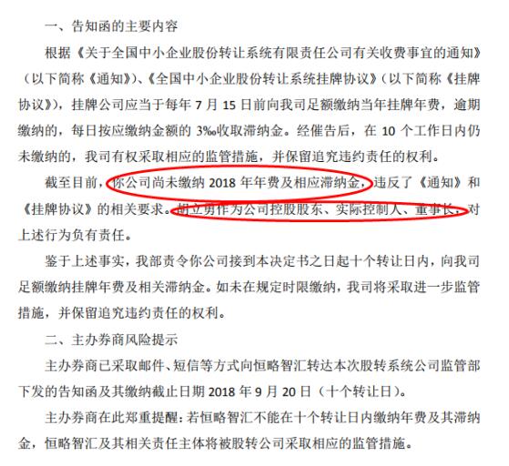 2018年9月14日,主辦券商光大證券發(fā)布風(fēng)險提示公告,恒略智匯本應(yīng)該在2018年7月15日交掛牌費,至今未繳納。