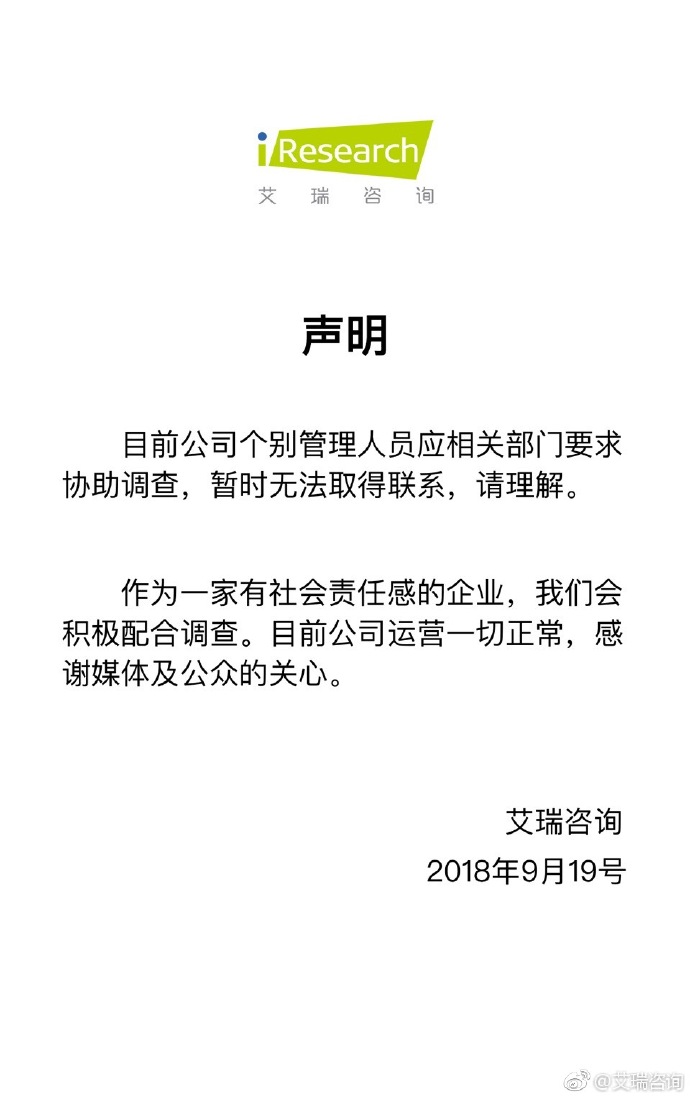 對(duì)此,艾瑞咨詢通過(guò)官方微博發(fā)布聲明,目前公司個(gè)別管理人員應(yīng)相關(guān)部分要求協(xié)助調(diào)查,暫時(shí)無(wú)法取得聯(lián)系,請(qǐng)理解。作為一家有社會(huì)責(zé)任感的且有,我們會(huì)積極配合調(diào)查,目前公司運(yùn)營(yíng)一切正常,感謝媒體及公眾的關(guān)心。